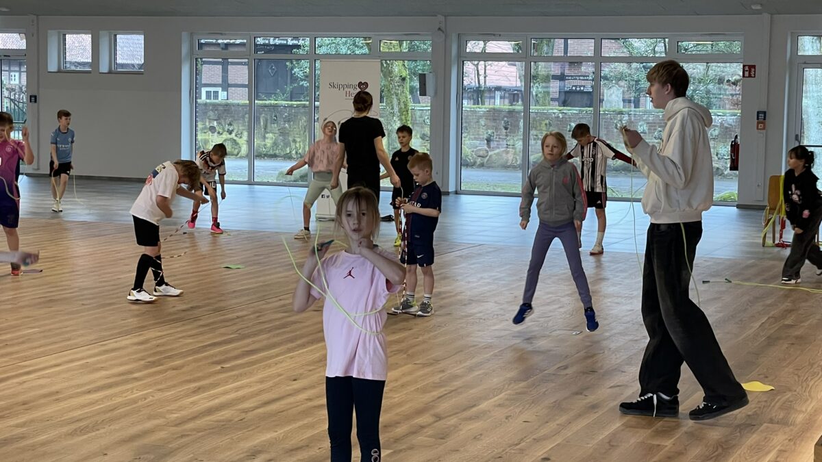 Heute nahm der gesamte 3. Jahrgang mit großer Begeisterung am Skipping Hearts Workshop (www.skippinghearts.de) teil. Ziel des Projekts ist es, Kinder frühzeitig für die Bedeutung von Bewegung zu sensibilisieren und die Stärkung des Herzmuskels spielerisch zu fördern. Zu Beginn erfuhren die Schülerinnen und Schüler, warum regelmäßige sportliche Aktivität so wichtig für ein gesundes Herz ist. Anschließend ging es direkt in die Praxis: Mit viel Energie und Motivation wurden zahlreiche Seilsprünge eingeübt. Vom Basic-Sprung über Partnerübungen bis hin zum anspruchsvollen „Criss Cross“ war alles dabei. Mit großer Freude probierten die Kinder die verschiedenen Techniken aus und wuchsen dabei über sich hinaus. Besonders spannend war es für sie, selbst zu spüren, wie ihr starkes Kinderherz bei Bewegung schneller schlägt – ein eindrucksvolles Erlebnis, das die Bedeutung von Sport unmittelbar erfahrbar machte. Ein herzliches Dankeschön gilt Frau Rafkes vom Skipping Hearts Team, die den Workshop mit viel Engagement, Geduld und guter Laune durchgeführt hat. Es war ein rundum gelungener Tag voller Bewegung und Begeisterung!
